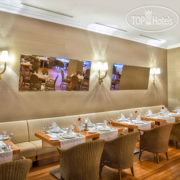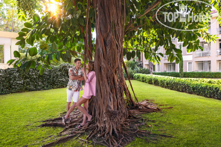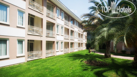 На территории домик для кошек, отель за ними ухаживает, детям будет интересно. Зелёные аллеи, гранатовые, цитрусовые деревья. На входе в отель шампанское во льду и напитки, но шампанское сладкое, и брюта нет нигде у них.
